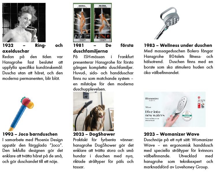 Hansgrohe har länge varit kända för tekniska innovationer. Selecta-duschen (1968) och Select-tekniken (2011) är exempel på produkter som kombinerar användarvänlighet med vattenbesparing.